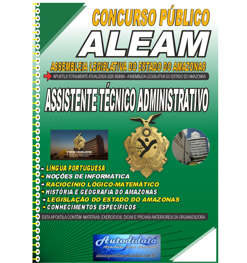 Apostila concurso da ALEAM 2025 – Assistente Técnico Administrativo. Material atualizado, organizado de forma didática e com conteúdo baseado no edital mais recente, oferecendo uma preparação completa e objetiva para o candidato.